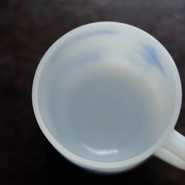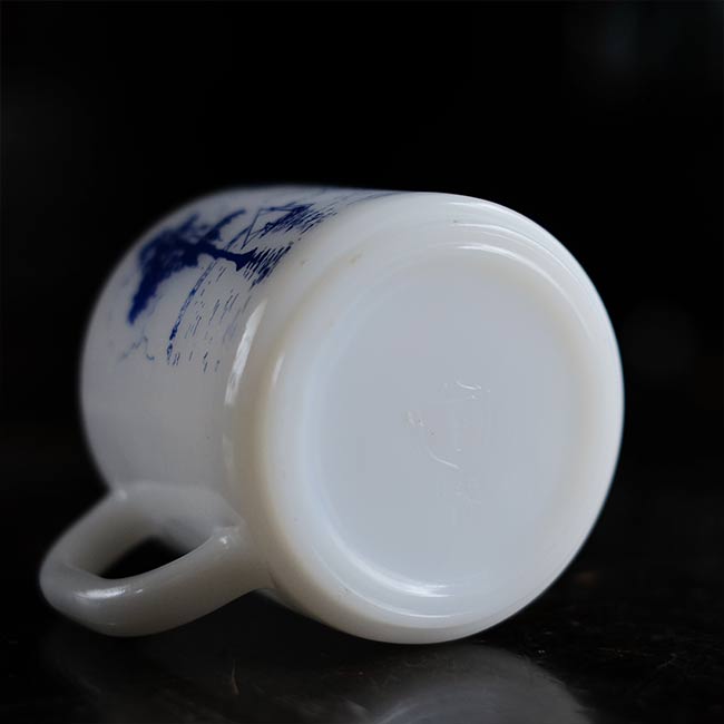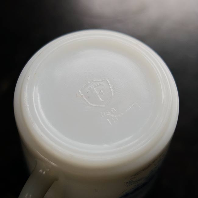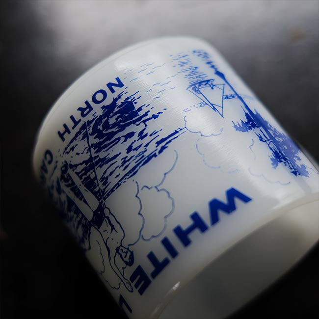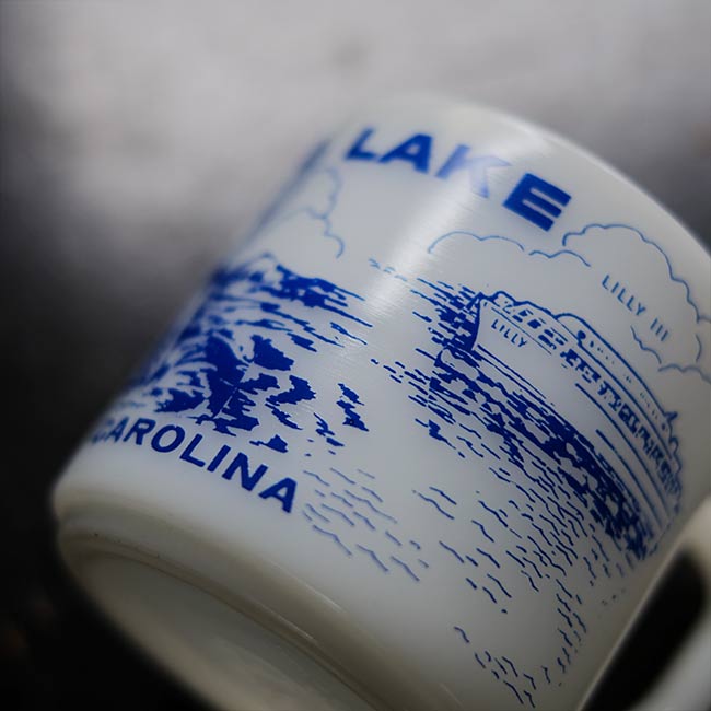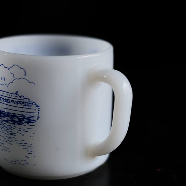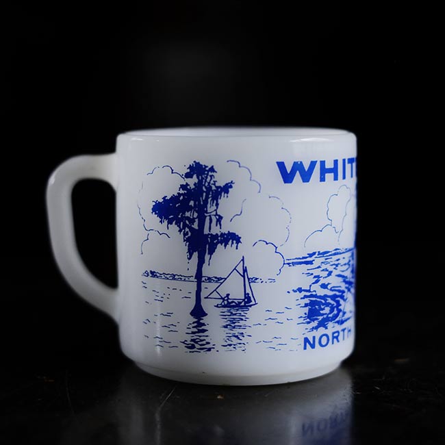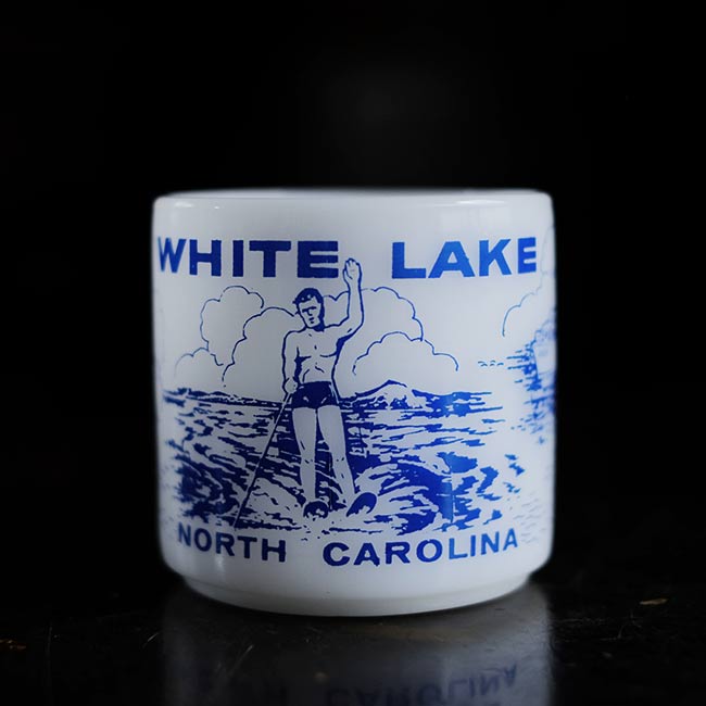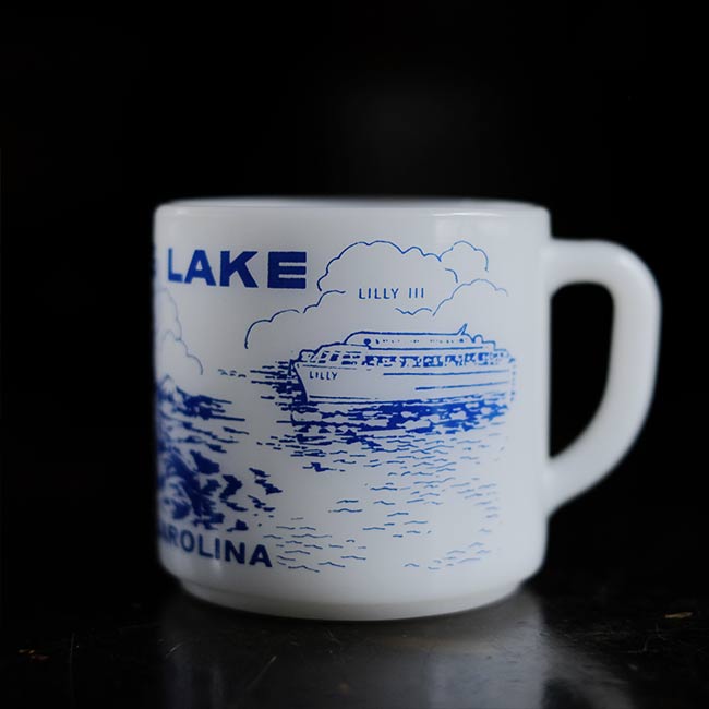 企業やキャラクターなどとのコラボが多く、絵柄が無数に存在するFederal(フェデラル)のミルクガラスのマグカップ。こちらはノースキャロライナのリゾート地、ホワイトレイクの絵柄が入っております。
